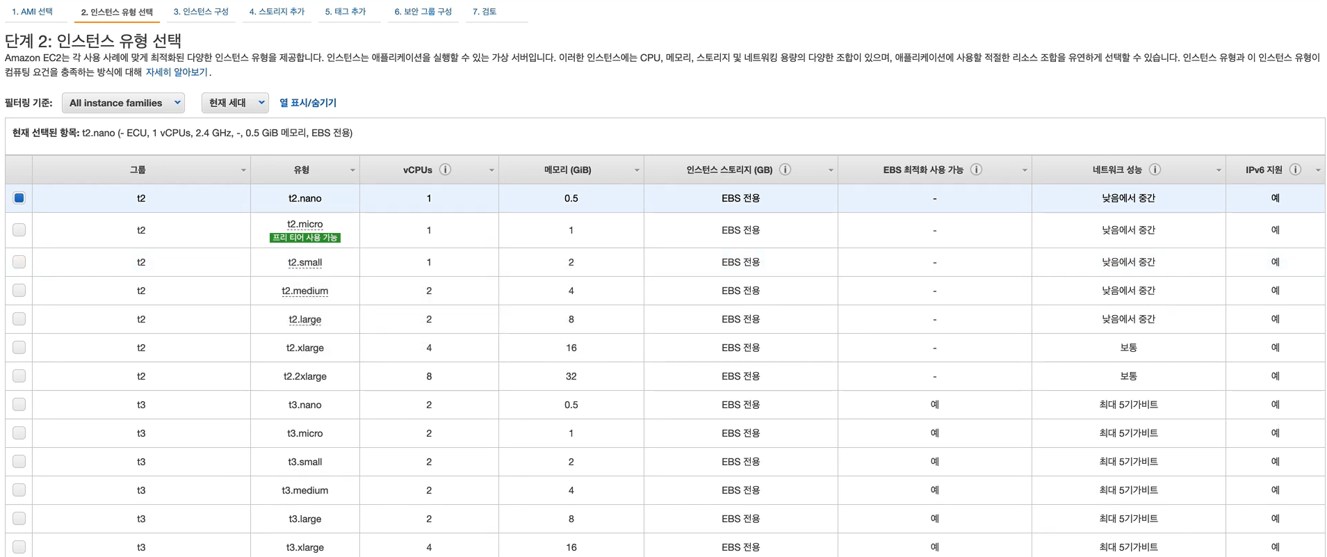 - 단계 2: (인스턴스 유형 선택) 우리가 사용하려는 컴퓨터의 사양을 선택 -> ex. t2.micro, t2.nano 등