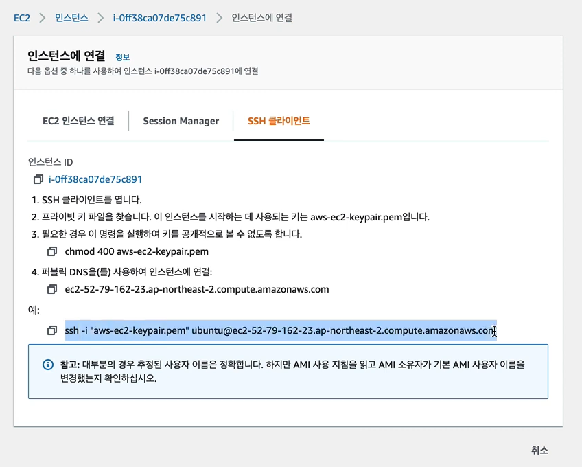 - EC2 인스턴스 연결 탭에서 연결을 누르면 간단하게 웹상에서 EC2 인스턴스의 터미널의 쉘에 접근할 수 있는 방법을 제공한다