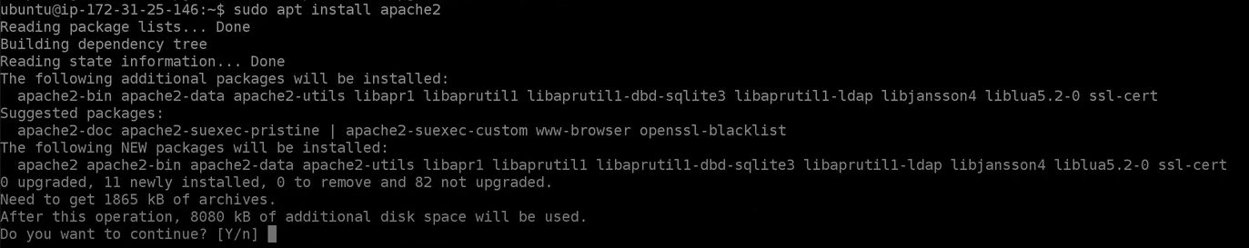 - sudo apt install apache2 -> 아파치 웹 서버를 설치 후 자동으로 아파치 웹 서버가 자동으로 실행, EC2 인스턴스의 IP주소를 통해 사용자들은 웹 서버에 접속할 수 있다.(퍼블릭 IPv4 주소나 퍼블릭 IPv4 DNS나 상관없다)