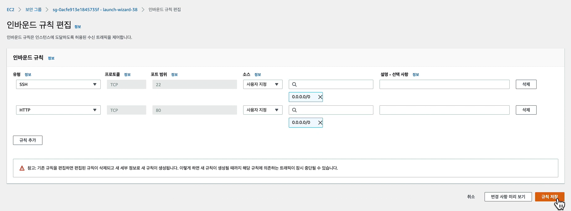 규칙 추가 선택 -> 유형은 (HTTP) -> CIDR블록에서 접속할 수 있는 IP를 정할 수 있다 (0.0.0.0/0) -> 규칙 저장