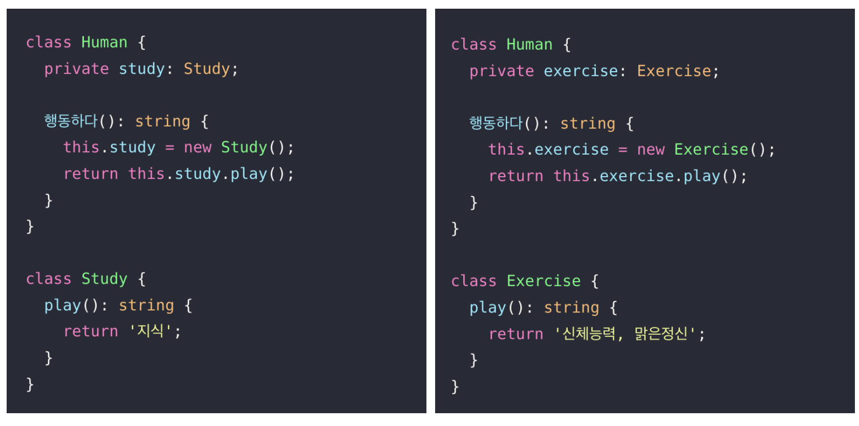 - Human에서만 활용가능 했던 메소드들을 다른 클래스에서 재사용할 수 있음